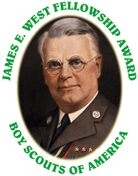 The James E. West Fellowship Award is recognized with a personalized certificate. In addition, a distinctive lapel pin ($1,000 -bronze pin, $5,000- silver pin, $10,000-gold pin, $15,000-diamond pin) and an exclusive knot for the uniform are presented at a special recognition program. The recipient will also be included in special Cradle of Liberty Council events and mailings in the future.